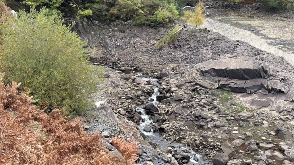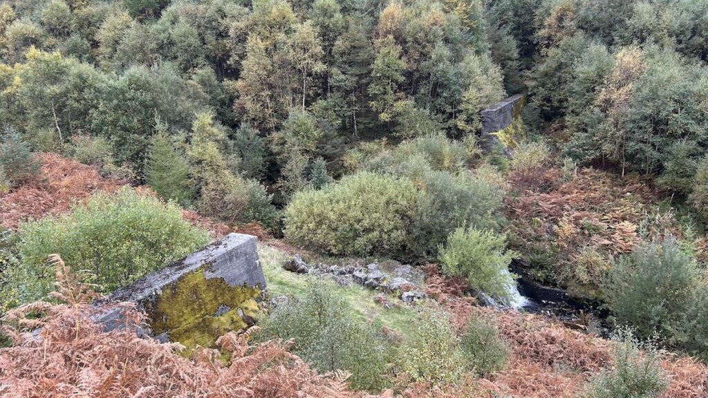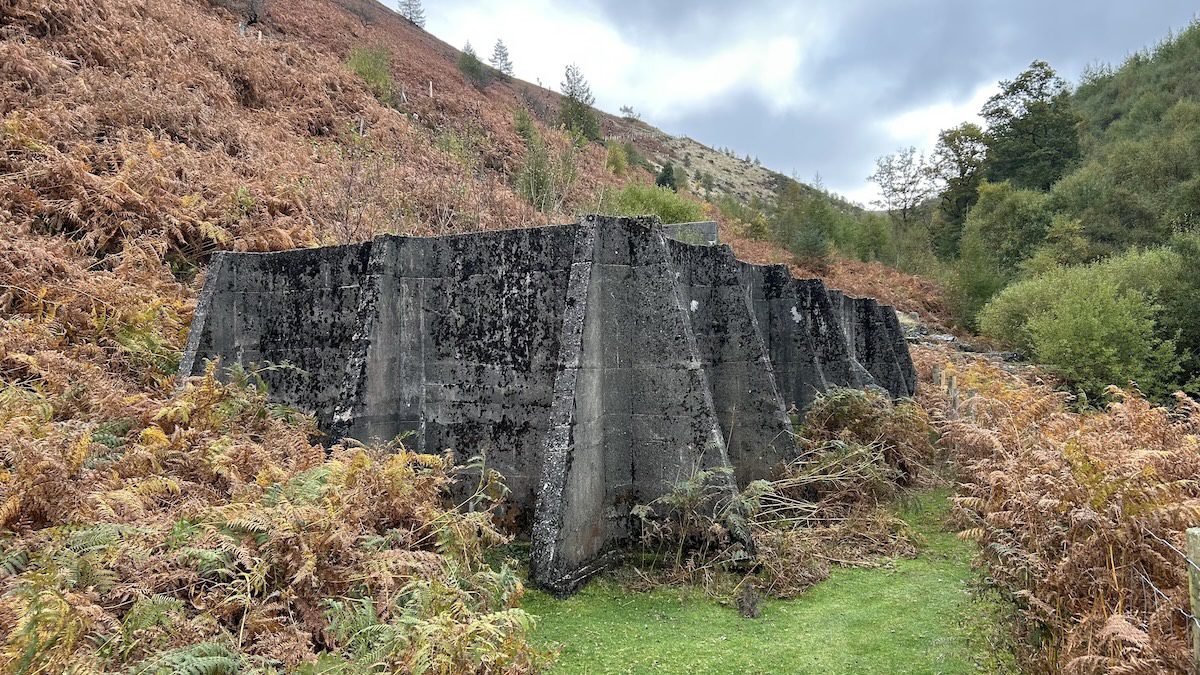 Further up the path, you will see the remains of the dam wall. After the wooden buildings in the workers’ village were decommissioned following the completion of the main reservoirs and dams, the Nant-y-Gro dam and reservoir became redundant.