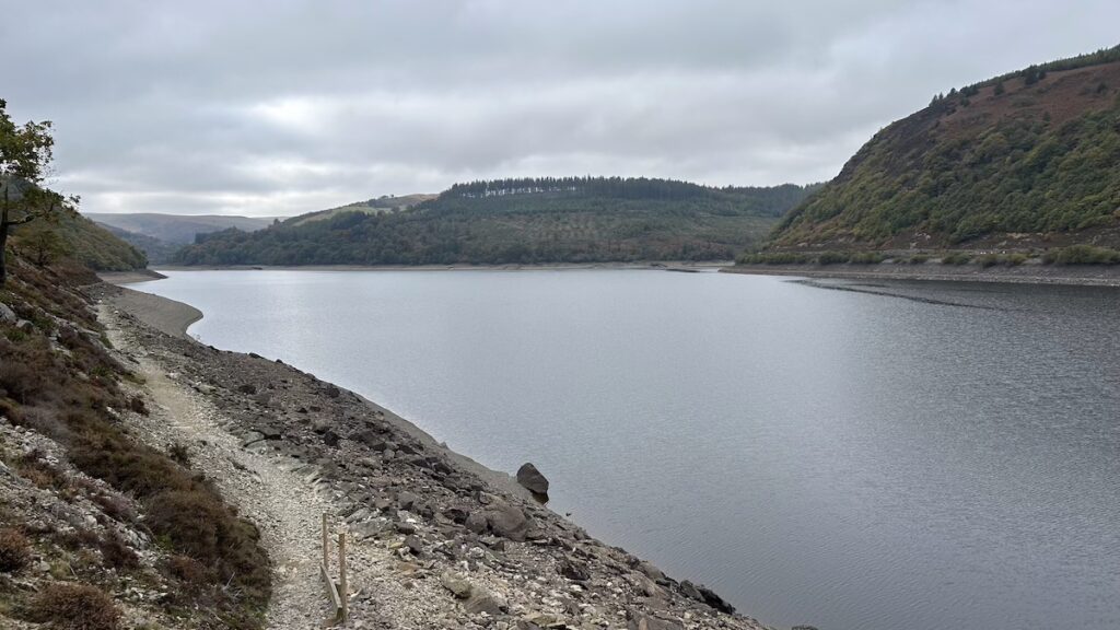 The path will now snake its way around the edge of the Caban Coch Reservoir, which was still in the process of filling up when we visited in early autumn after a dry summer. Here you will start to take in the scenic views of the Elan Valley.