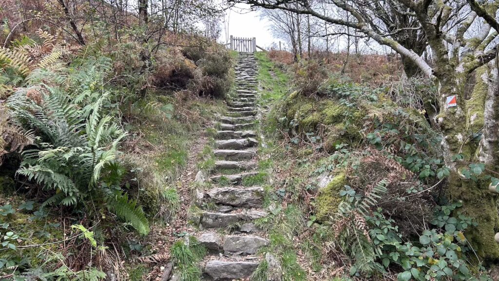 Continue along the path until you reach a staircase leading to the left. Signs marking the Nant-y-Gro Trail also point the way.