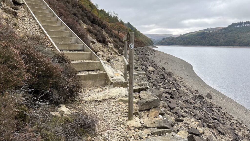 At the back of the power station, walk up the stairs. A section of the pathway contains an original staircase from the construction of the Caban Coch Dam. Take care as it can have uneven surfaces. Head through the gate at the top and turn right.